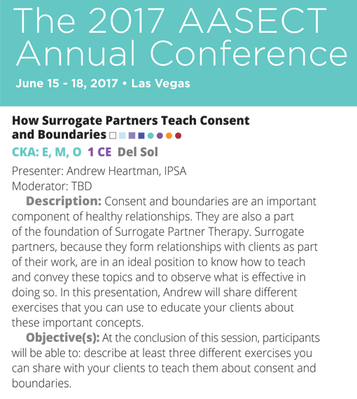 "Surrogate Partner Therapy: Tools and Lessons that all Providers can apply to Patient Care." This was a presentation made at the annual meeting/conference of ISSWSH (International Society for the Study of Women's Sexual Health) by Andrew Heartman and Dr. Heather Howard, on March 6th, 2021. Andrew introduces Surrogate Partner Therapy and examples of exercises commonly used in that modality, and then Heather explains how the concepts and exercises can be adapted and used in other contexts.